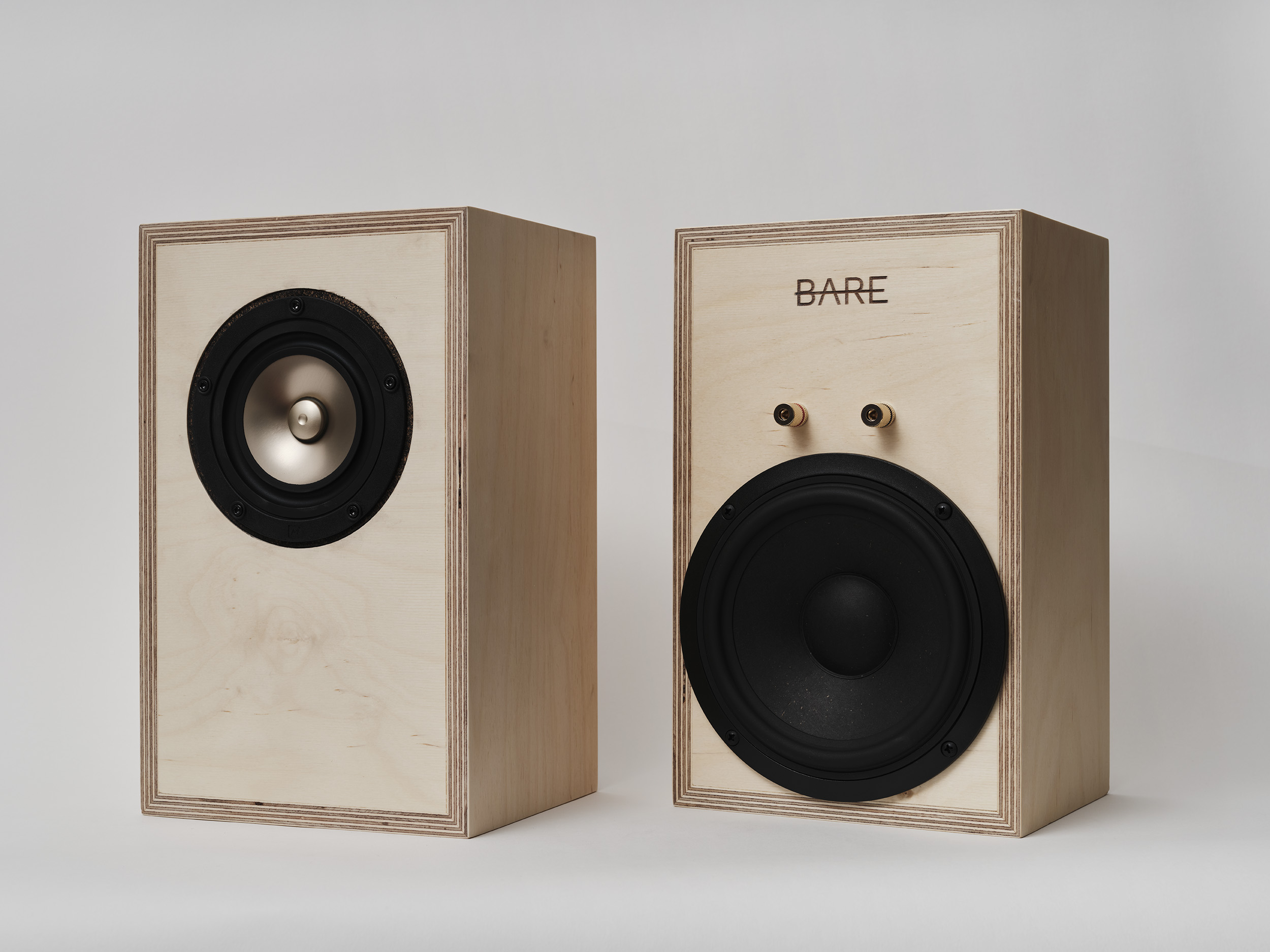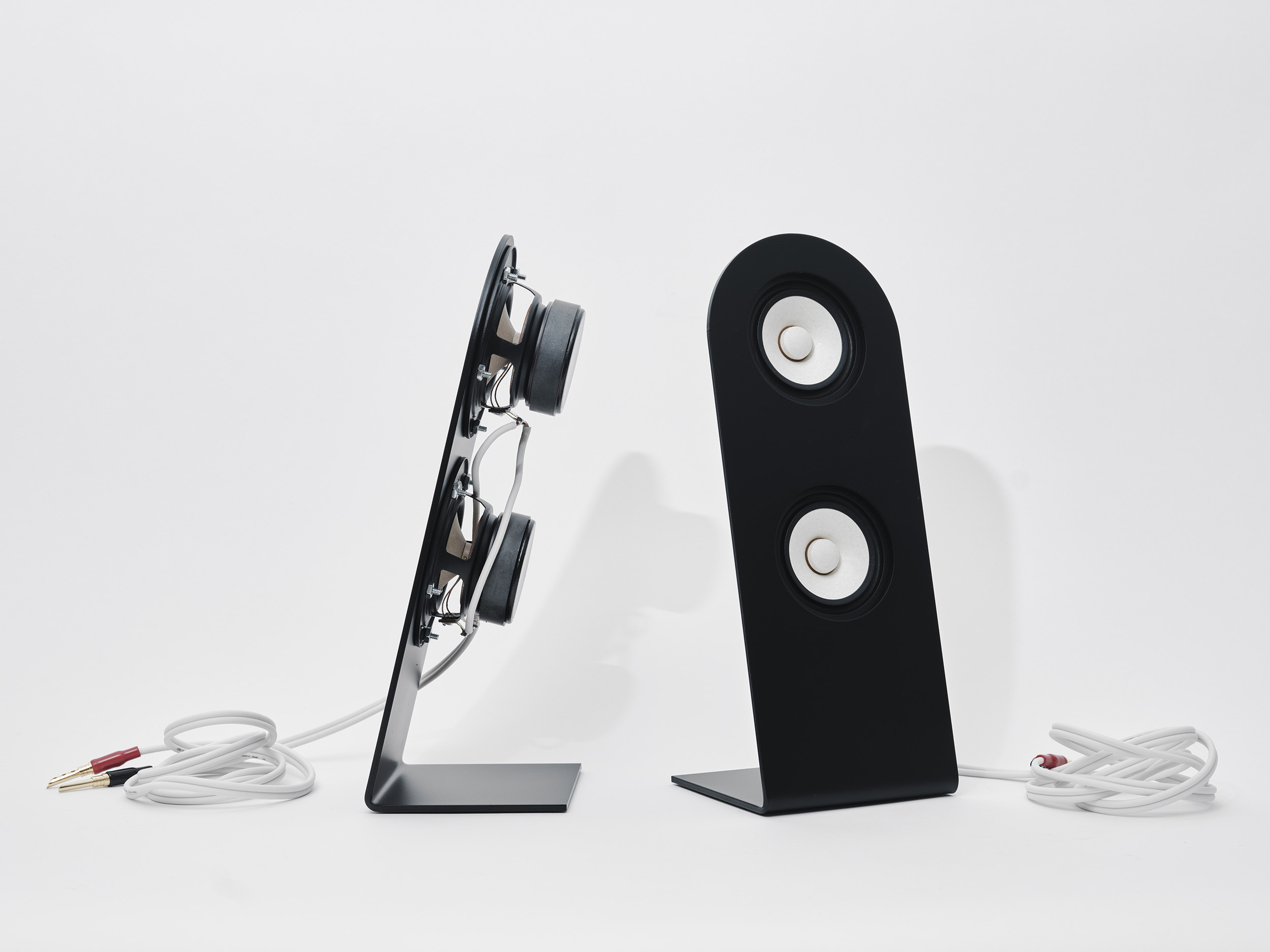 Each unit features two 3-inch full-range drivers made from natural paper fiber, creating a striking contrast with the raw steel of its open baffle stand. The steel will change over time, and develop rust, which is an intentional aspect of its aesthetic.