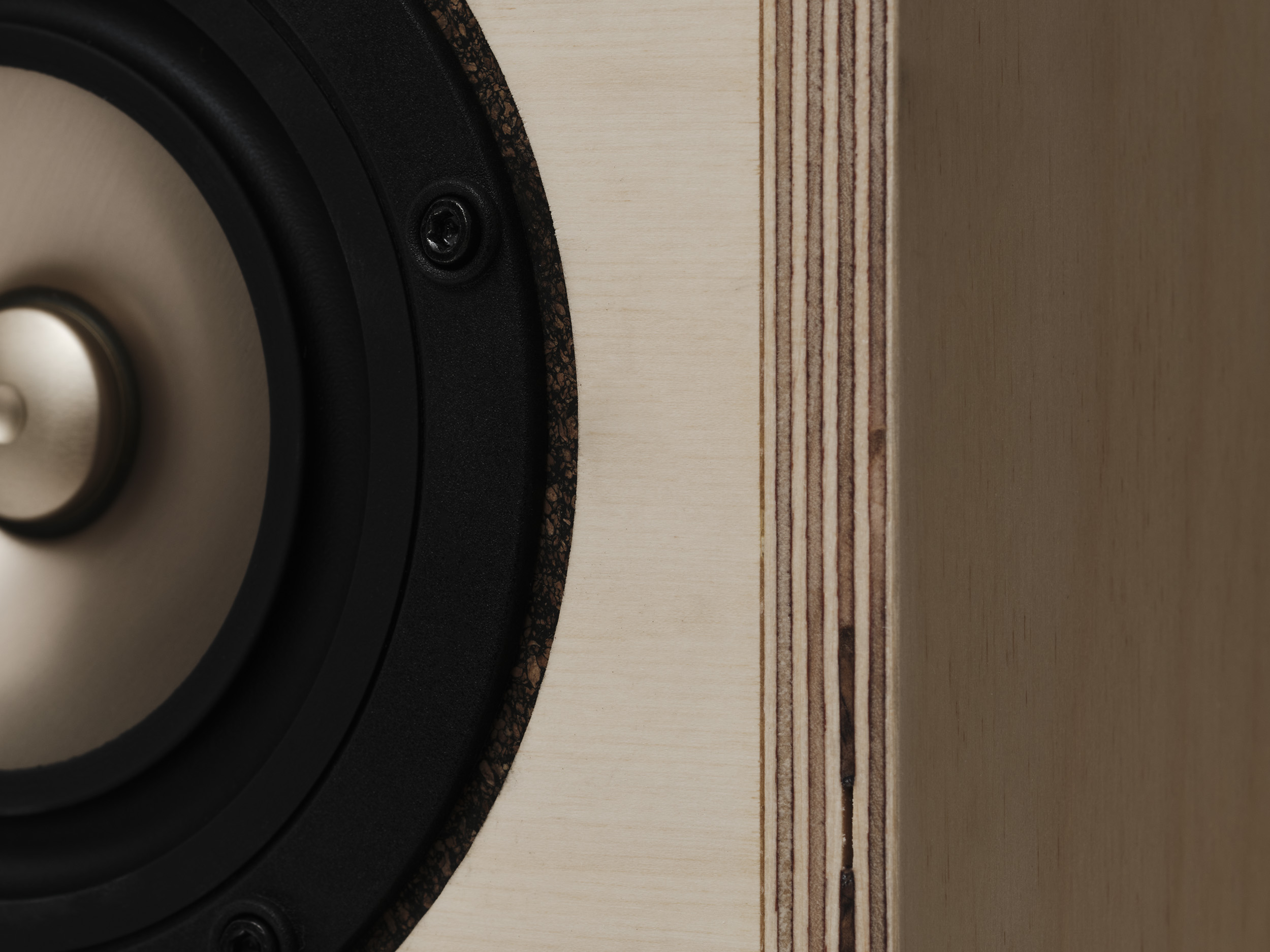 The front driver features a subtle chrome magnesium alloy cone, housed in an all-wood enclosure. Made from Baltic birch, treated with the finest natural oil and internally braced to ensure optimal structural integrity. A custom rubberized cork gasket supports the driver, enhancing its performance.